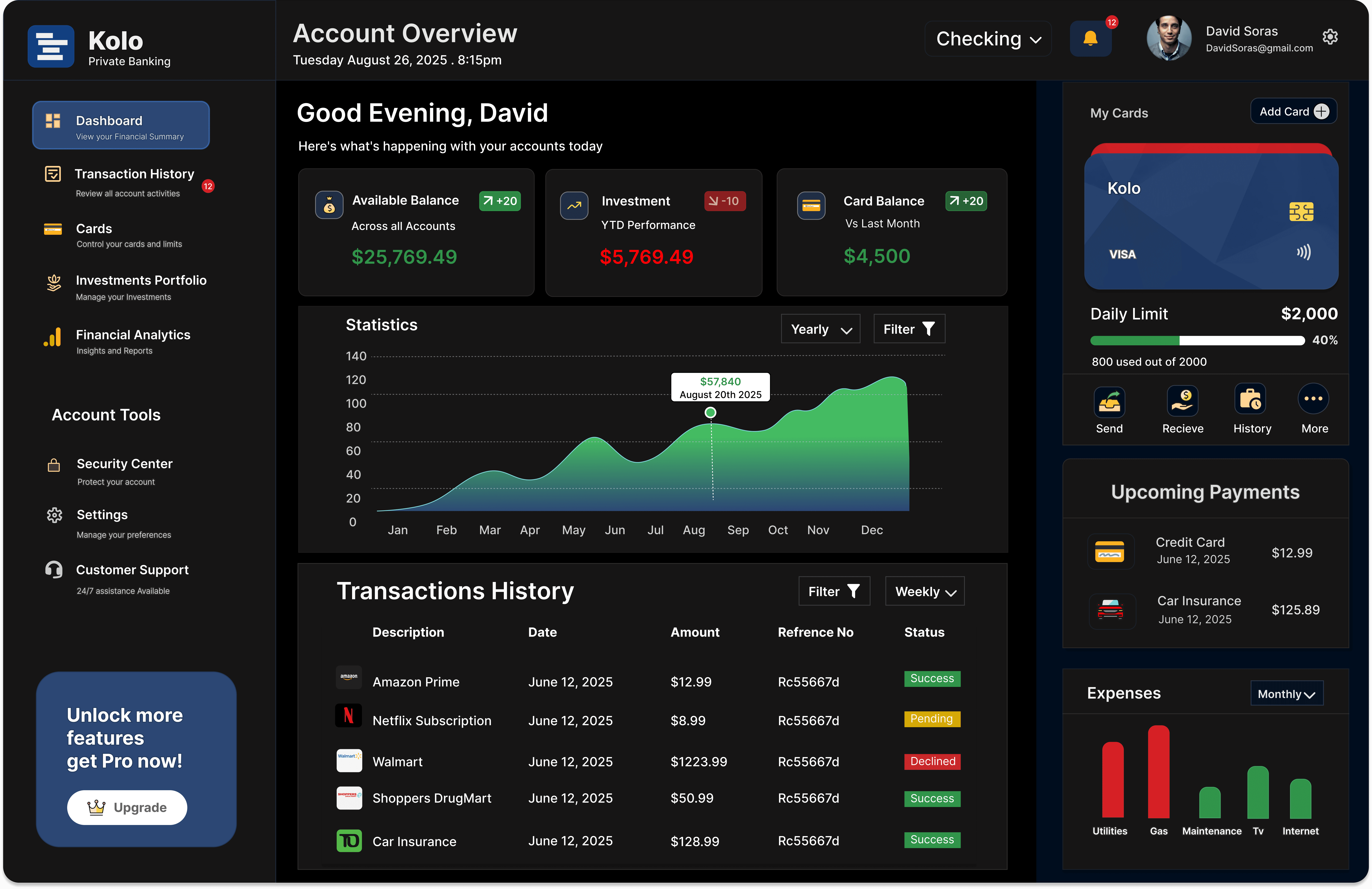 Kolo makes managing my finances feel effortless. I can see all my accounts, track spending, and send payments all in one clean dashboard.